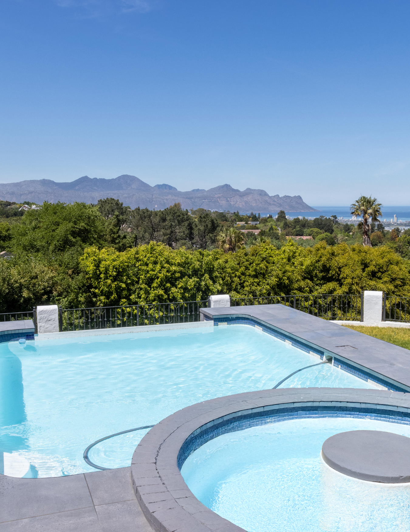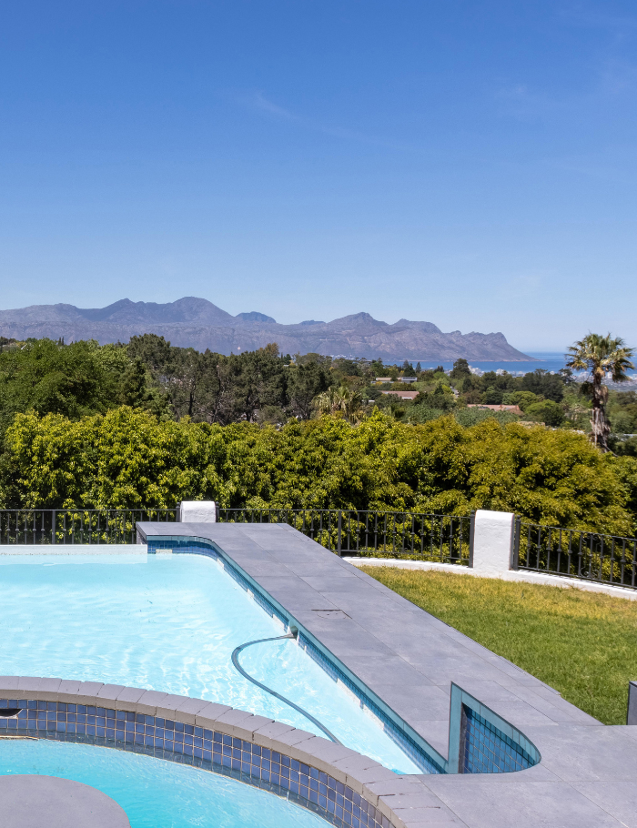 Step outside to a beautifully landscaped patio overlooking the bay and Strand, complete with a private swimming pool, decked lounging area, and two braai setups—one covered, one open air—alongside a wood-fired pizza oven.